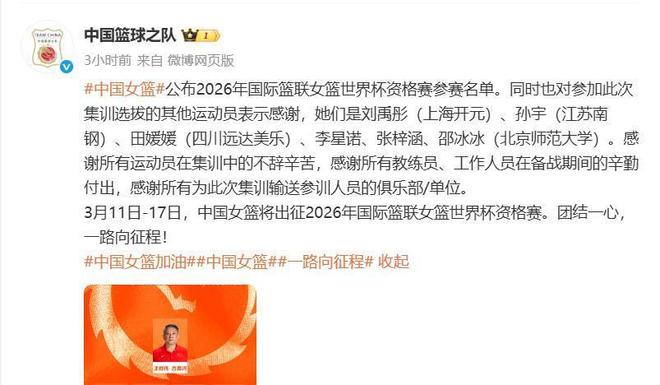 3月10日上午,中国女篮通过官方渠道公布了参加这次世预赛的12人大名单,刘禹彤等6人遗憾落选,女篮国家队也向她们表示了感谢。在这12人大名单中只有韩旭、李月汝、王思雨和张茹等4人参加过上一届的女篮亚洲杯,时隔四年中国女篮再出发,目标依旧是总冠军。值得一提的是上一届女篮国家队的队长是杨力维,新一届女篮国家队的队长是杨舒予,她不仅是杨力维的妹妹,更是中国女篮的后场主力核心。