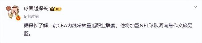 CBA联赛已经在前几天确定了27-28赛季恢复升降级的具体方案,不少NBL球队都开始对阵容进行补强。在合肥狂风签下了广东男篮旧将王薪凯后,河南焦作文旅也签下了北京男篮旧将常林,媒体人“球圈赵探长”在社交媒体上透露了这个消息。