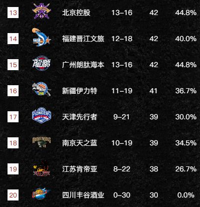 北控第十三,福建凭借着出色的发挥来到了第十四名,广州队第十五、新疆队掉到了第十六名的位置,天津队第十七名、南京队第十八名、江苏队第十九名、四川队三十连败第二十名!