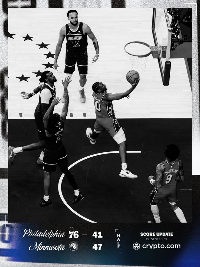 76人队的乔治得到23分、6个篮板和6次助攻,马克西得到21分、6个篮板和8次助攻,乌布雷得到21分和5个篮板,恩比德得到19分、13个篮板和7次助攻,格里梅斯得到10分和4个篮板,巴洛得到7分和10个篮板。森林狼队的海兰德得到21分和5个篮板,兰德尔得到21分和7个篮板,多苏姆得到19分和5个篮板,里德得到12分和7个篮板,迪文琴佐得到11分,爱德华兹15投3中得到8分,戈贝尔得到5分和16个篮板。