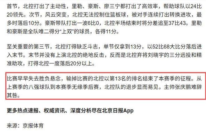 《北京日报》亦刊发评论直言:“从上赛季八强劲旅到本赛季无缘季后赛,北控退步之剧烈令人震惊,主帅张庆鹏负有不可推卸的领导责任。”