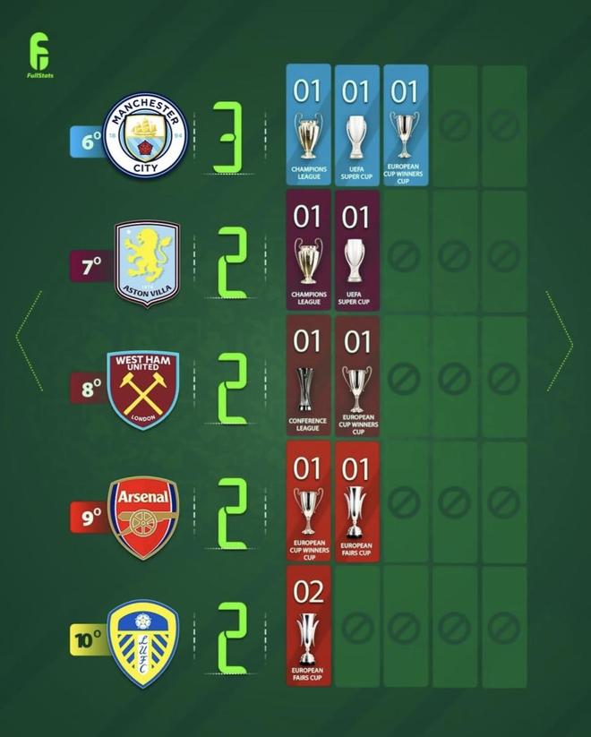 曼城是3座:欧冠1座(2023)+欧洲超级杯1座+欧洲优胜者杯1座,属于近年才把顶级欧战拼图补齐的代表。阿斯顿维拉2座里也有欧冠1座(1982),说明它在历史上确实站上过欧洲之巅;西汉姆联则用欧协联1座与欧洲优胜者杯1座把自己抬进“2座俱乐部”行列,冠军年代不同、含金量结构不同,但在这张榜里被统一按总数并列呈现。