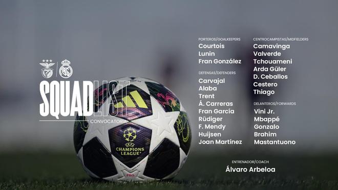 北京时间2月16日,皇马公布欧冠淘汰赛附加赛首回合客战本菲卡的大名单,姆巴佩领衔,劳尔-阿森西奥、罗德里戈停赛,贝林厄姆、米利唐伤缺。