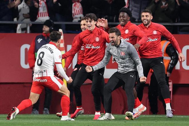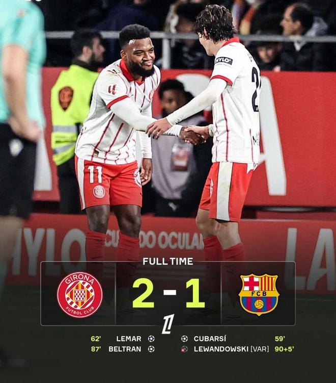 第86分钟,争议出现。孔德在解围时被埃切维里踩到脚踝倒地,裁判示意比赛继续。球权转换之间,罗卡回敲,贝尔特兰迎球低射破门,赫罗那2-1首次反超,巴萨全队围住裁判抗议,但进球有效。