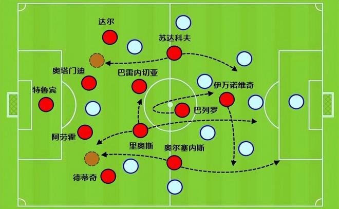 中锋帕夫利季斯不但是箭头,还能拉边接球主导反击推进。在他接球的同时,原本是落防中场的左边锋谢尔德鲁普快速前插,随后冲入禁区后接应中锋帕夫利季斯的传中球,完成门前的冲击得分。