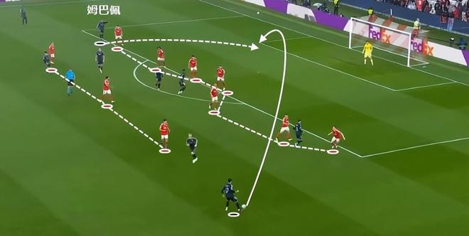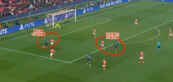 姆巴佩就是在面对对手偏弱的边后卫时,利用自己的速度和爆发力突然启动,甩开防守人头球破门。这样的打击方式原本是皇马最擅长的手段之一,只是姆巴佩一般情况下并不怎么喜欢接应传中球。如果他愿意多尝试,会是打击本菲卡的有效手段之一。