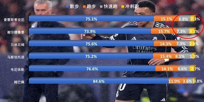 普雷斯蒂安尼虽然冲刺跑比例2.3%不算特别高,不过算上快速跑后,这两项数据综合也要接近10%,达到了高水准。相比之下,姆巴佩冲刺跑仅有0.8%,加上快速跑之后也仅有4.4%。