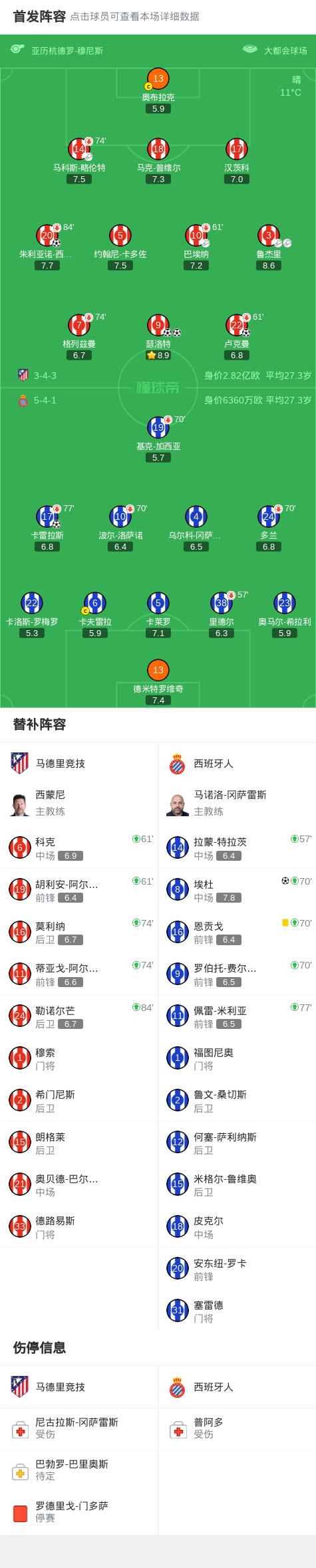北京时间2月22日西班牙足球甲级联赛 联赛 第25轮,马德里竞技主场对阵西班牙人。上半场,卡雷拉斯破门,瑟洛特扳平比分。下半场,巴埃纳助攻,小西蒙尼帮助马竞反超比分。鲁杰里随后送出两次助攻,卢克曼和瑟洛特相继破门。埃杜远射得分,为客队扳回一城。全场比赛结束,马竞4-2击败西班牙人。