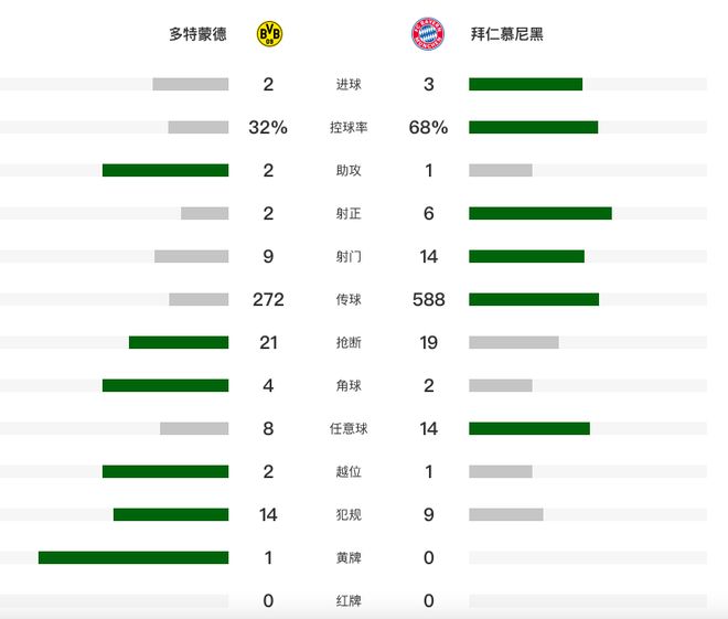 北京时间3月1日凌晨,德甲第24轮迎来国家德比,多特蒙德坐镇主场迎战拜仁。第26分钟,施特罗贝克头槌破门,这是多特蒙德的第一次射门。第54分钟,格纳布里助攻凯恩破门。第70分钟,施特罗贝克送点,凯恩点射梅开二度。第83分钟斯文松扳平比分,4分钟后基米希绝杀。最终,总身价9.6亿的拜仁客场3-2战胜多特蒙德,终结大黄蜂的16轮不败,在还剩10轮的情况下,领先多特蒙德11分。