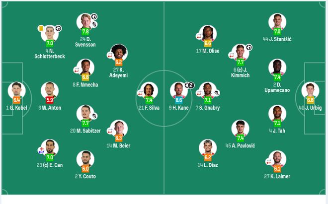 拜仁慕尼黑首发:40-乌尔比希、2-于帕梅卡诺、4-塔、44-斯坦尼西奇、45-帕夫洛维奇、6-基米希(90’8-格雷茨卡)、7-格纳布里(62’10-穆西亚拉)、27-莱默尔(90’20-比朔夫)、14-迪亚斯、17-奥利塞(90’3-金玟哉)、9-凯恩。