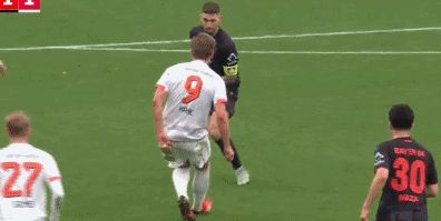 第74分钟,路易斯-迪亚斯抬脚过高踢到阿莱士-加西亚的头部,裁判出示黄牌。第83分钟,凯恩禁区前沿挑传,路易斯-迪亚斯禁区内倒地,裁判认为他假摔,出示第二张黄牌,拜仁剩下9人应战。