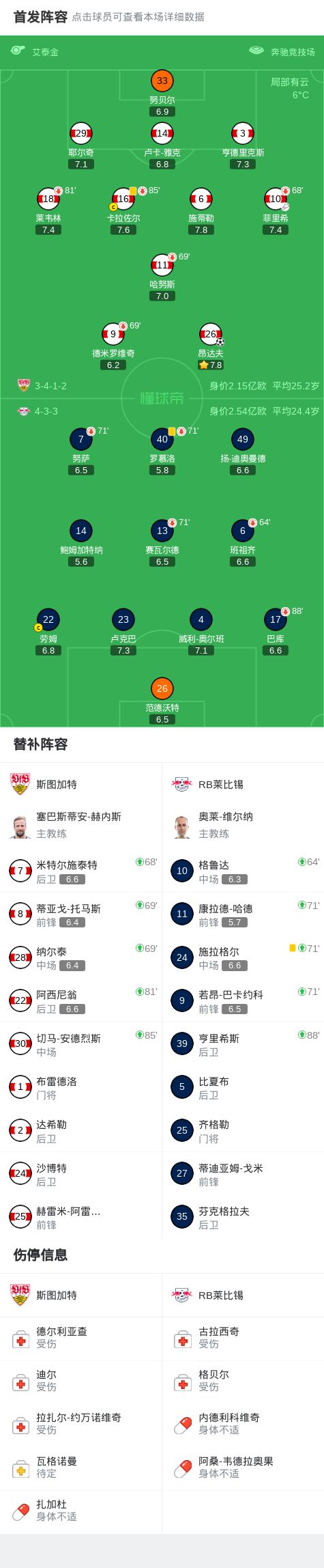 北京时间3月16日德国足球顶级联赛第26轮,斯图加特主场对阵RB莱比锡。下半场昂达夫打入制胜球。最终比分斯图加特 1-0 RB莱比锡。