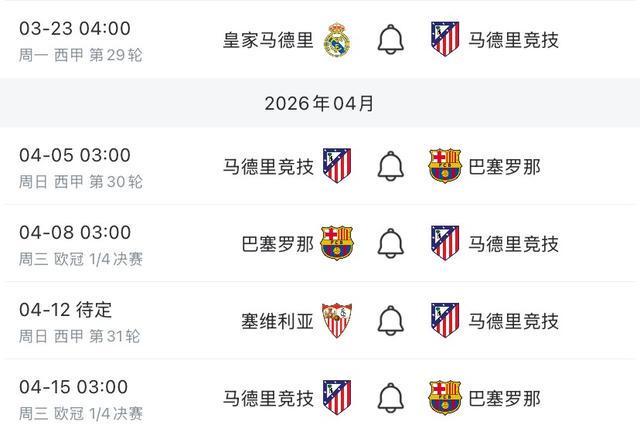 根据安排,马竞即将迎来一段魔鬼赛程,本周末他们将在西甲第29轮的马德里德比中做客挑战同城死敌皇马。国际比赛日过后,马竞将首先在西甲第30轮的比赛中坐镇主场对阵巴萨,那场比赛三天后他们又会迎来欧冠1/4决赛首回合客场与巴萨的比赛。一周之后,他们与巴萨的次回合比赛还将移师大都会球场进行,而在欧冠与巴萨的两回合比赛之间,他们还有一场客场与塞维利亚的西甲第31轮比赛需要进行准备。