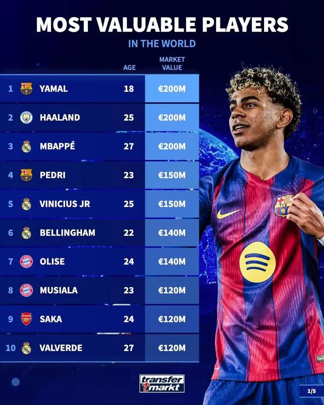 其中西甲联赛球员中,身价最高的为亚马尔、姆巴佩,他们的身价均为2亿欧,英超联赛身价最高的球员则是哈兰德,他目前的身价也是2亿欧,德甲联赛身价最高的球员为目前效力于拜仁的奥利塞,他的身价为1.4亿欧,法甲联赛身价最高的是效力于巴黎的内维斯,他目前身价为1.1亿欧。意甲方面,身价最高的是来自国米的劳塔罗,他目前身价为8500万欧,排在这份榜单第29的位置。