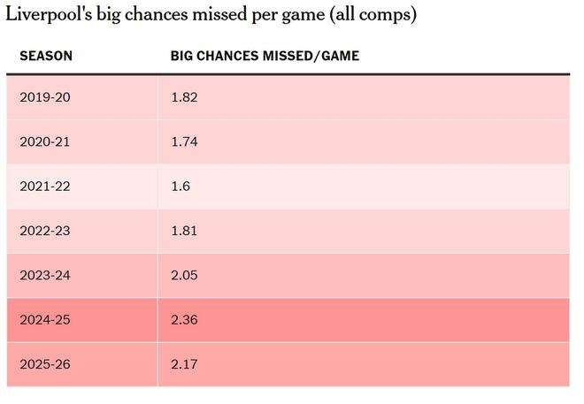 更令利物浦担忧的是,他们在欧冠中进球最多的球员是索博斯洛伊(5球)和麦卡利斯特(3球)——两人都是中场。维尔茨在一个断断续续的首个赛季中表现未达预期,但他的多次射门被最后一名防守球员封堵,最明显的是最近主场输给曼城的比赛。这位德国人也浪费了对阵桑德兰的两次绝佳机会,在对阵马赛、伯恩利和阿森纳的比赛中也被拒之门外,但他在对阵水晶宫时本应做得更好。