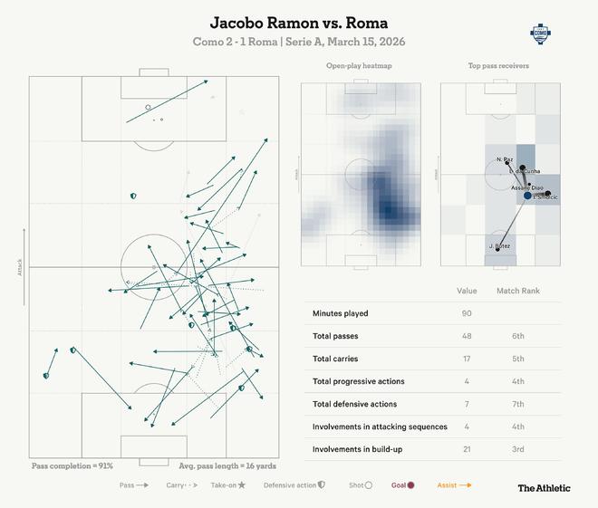 在对阵罗马的上半场,法布雷加斯希望他的中卫哈科沃-拉蒙把他的盯防对象斯蒂芬-埃尔沙拉维带到他不想去的位置。拉蒙移动到中场。他也曾上提到右路高位。这造成的混乱让科莫获得了优势。拉蒙在高位赢得了二次球权和对抗。他还作为多出来的一个人参与进攻。“今天管用的明天可能就不管用了,”法布雷加斯坦言。但对罗马,它管用了。