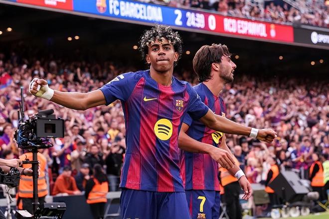 第87分钟,西班牙人中圈回传失误,亚马尔反应断球单刀赴会过掉门将推入空门锁定胜局,3:1!18岁的亚马尔2射1传独造3球,这赛季43场出场贡献了22球17助攻;同时他也成为了自1959年以来,首位19岁前在五大联赛打入29球的球员。第89分钟,德容前插下底传中,拉什福德凌空垫射将比分锁定在了4:1!
