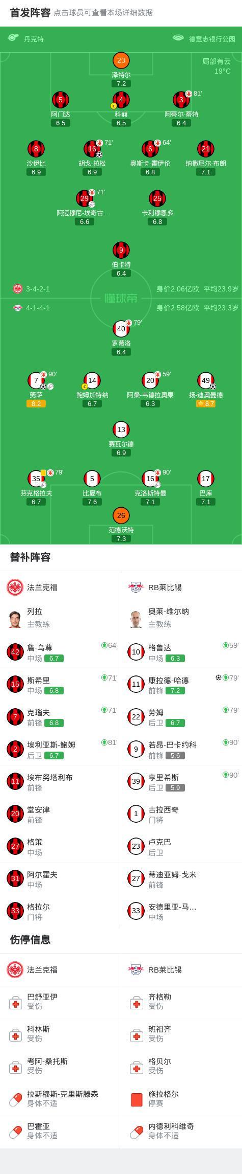 北京时间4月19日德国足球顶级联赛 第30轮,法兰克福主场对阵RB莱比锡。上半场迪奥曼德首开记录,拉松扳平比分,下半场努萨破门扩大领先优势,哈德破门再下一城。最终比分法兰克福 1-3 RB莱比锡。