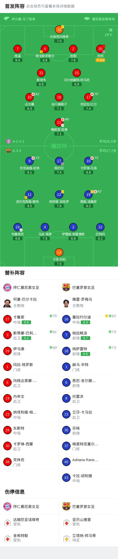北京时间4月26日女足欧冠 半决赛首回合,拜仁慕尼黑女足对阵巴塞罗那女足。上半场帕约尔首开记录,,下半场克特扳平比分。80分钟克特拼抢中拉拽对方球员头发被红牌罚下。最终比分拜仁慕尼黑女足 1-1 巴塞罗那女足。