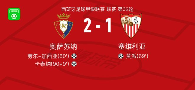 北京时间4月27日西班牙足球甲级联赛 联赛 第32轮,奥萨苏纳主场对阵塞维利亚。奥萨苏纳劳尔-加西亚破门,卡泰纳破门。塞维利亚莫派破门。最终比分奥萨苏纳 2-1 塞维利亚。