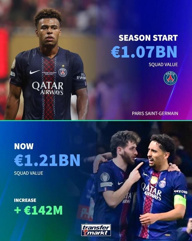 德转盘点本赛季身价上涨最高球队:
