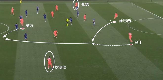 这一次的进攻很典型,巴萨一侧边锋内收时,边后卫就要跟边锋一样拉开宽度。孔德的特点,是更合适边锋拿球后,他无球套上外线接应,所以他相对靠后一点,但不等于说孔德不参与进攻。