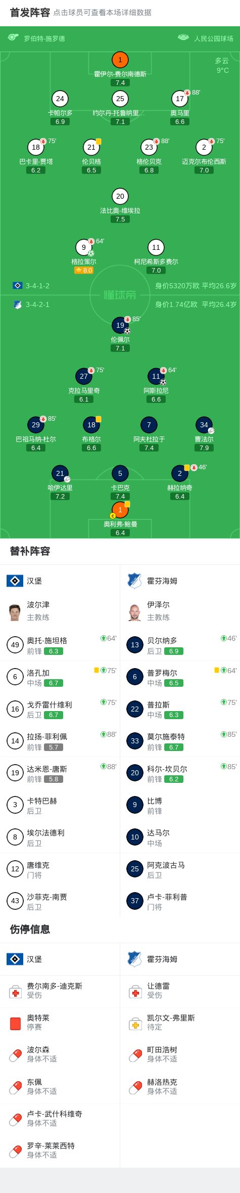 北京时间4月26日德国足球顶级联赛 联赛 第31轮,汉堡主场对阵霍芬海姆。汉堡格拉策尔破门。霍芬海姆阿斯拉尼破门,伦佩尔破门。最终比分汉堡 1-2 霍芬海姆。