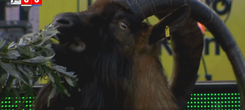 第33分钟,镜头给到场边,科隆队吉祥物在进食